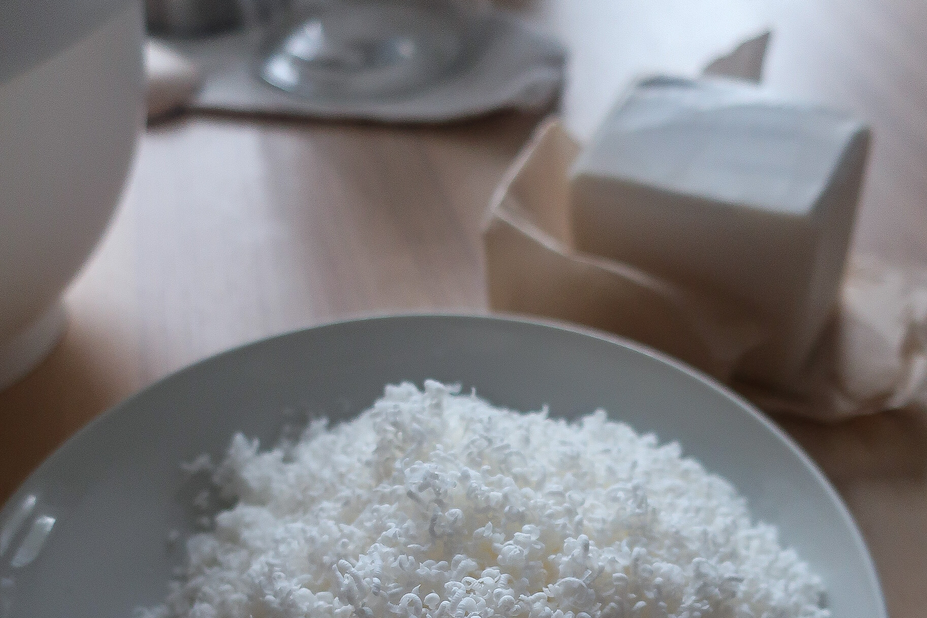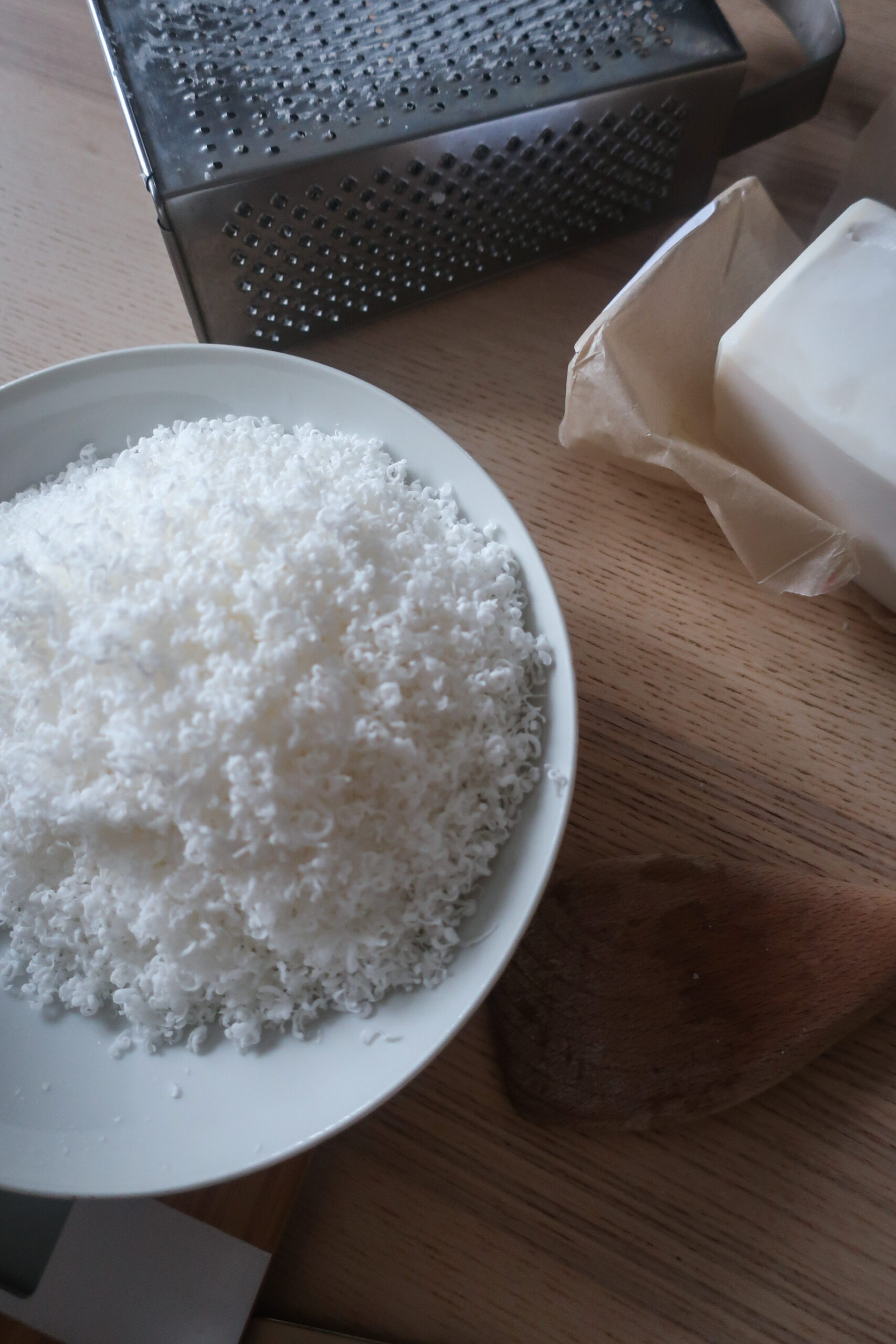 - Mýdlo nastrouháme na struhadle na jemno a nebo použijeme již hotové mýdlové vločky či “nudličky”.