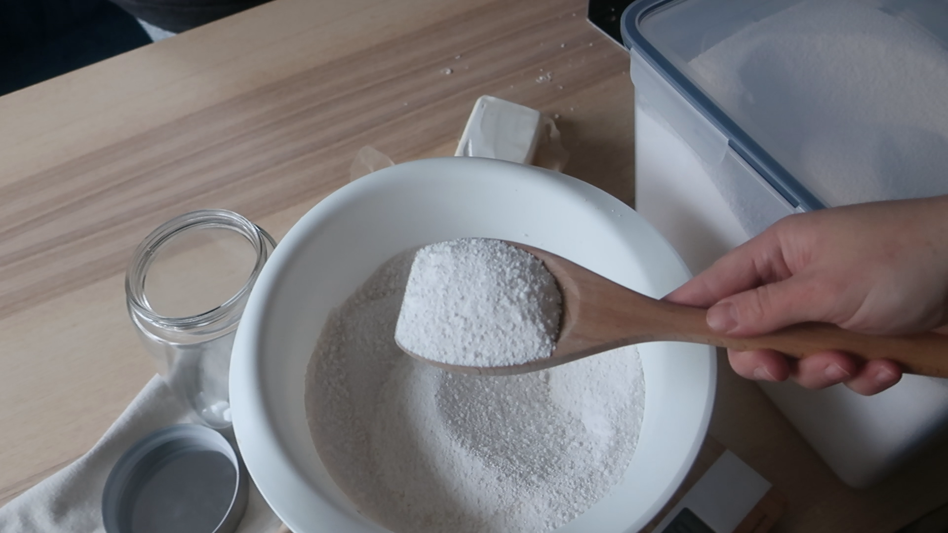 - Prací prášek uskladníme do vzduchotěsné nádoby. Na jednu plnou pračku (6 kg) použijte 1-2 PL prášku.
