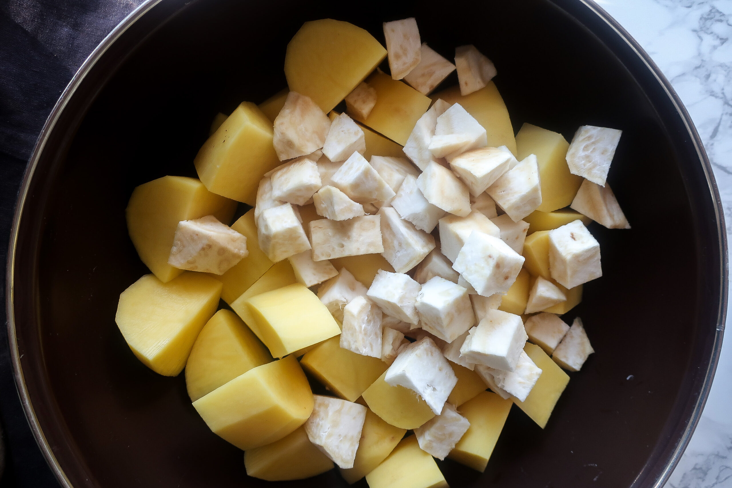 1. Brambory oloupeme a nakrájíme na kostky o hraně cca 2-3 cm. Celer očistíme, vnější vrstvu oloupeme nebo odřežeme a vnitřní bílou část nakrájíme na malé kostičky o hraně 1 cm. Pokud chceme je noky jen z brambor, tak použijeme dohromady 1 kg brambor.