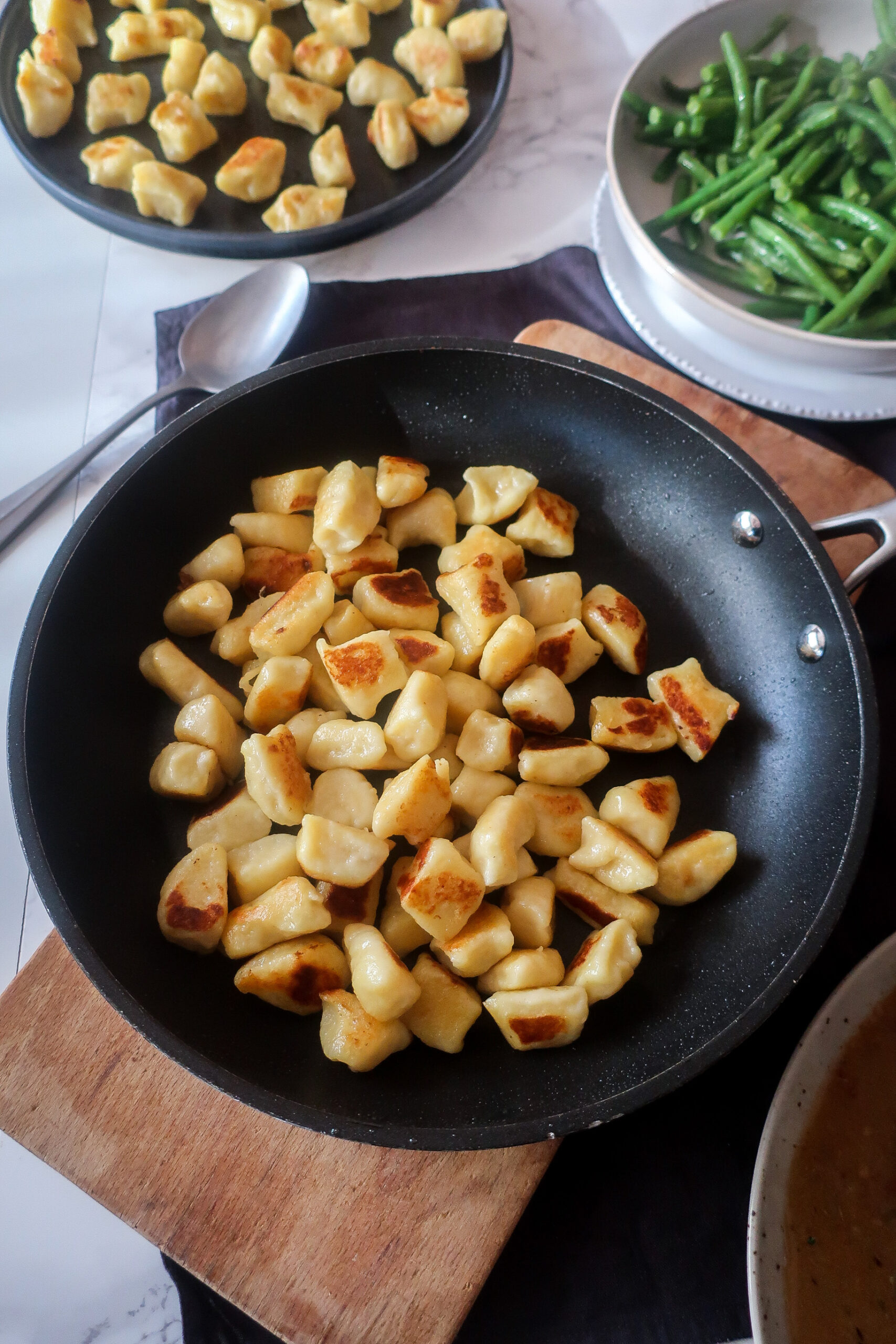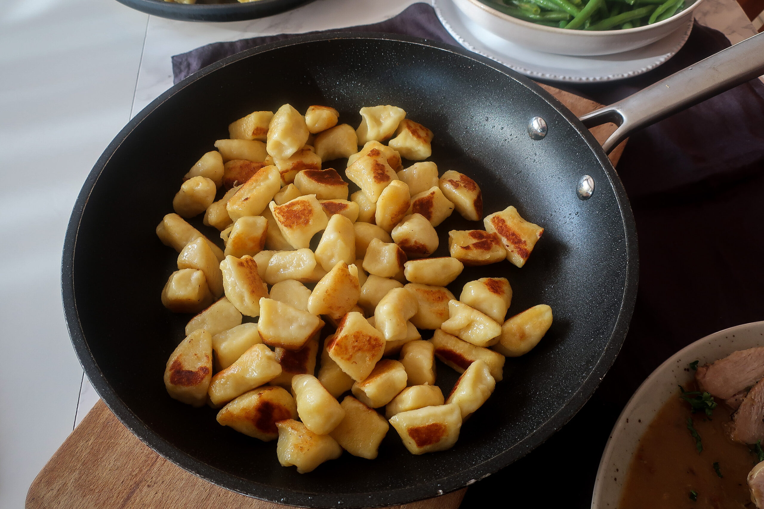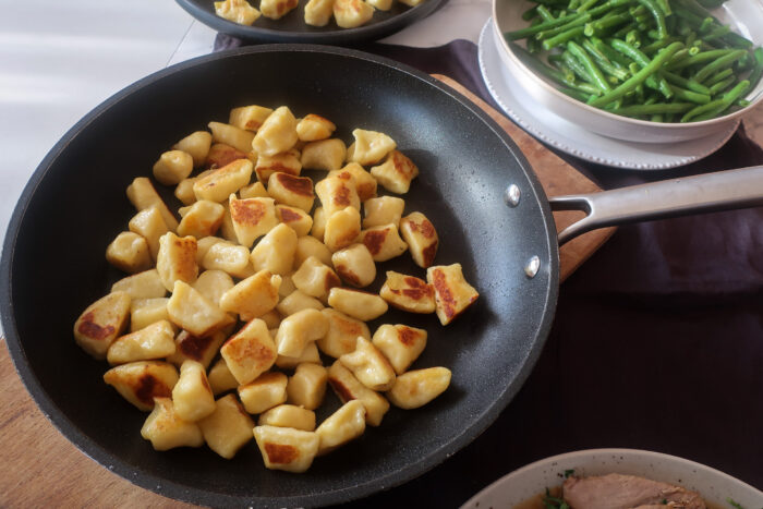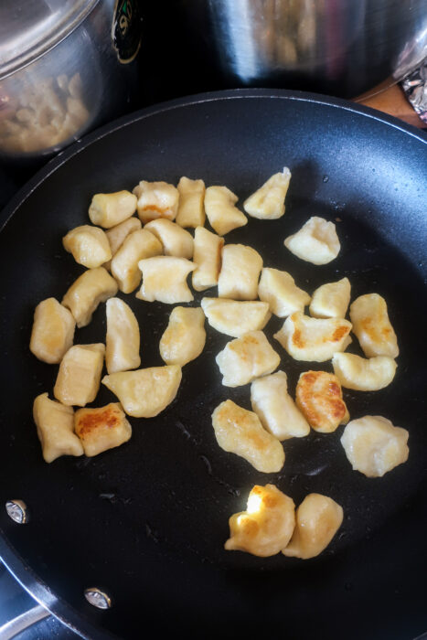 Opékání noků: Vyskládáme noky v jedné vrstvě do rozpálené nepřilnavé pánve s trochou oleje. Když jsou z jedné strany opečené, otočíme na druhou stranu a opékáme dozlatova. Pánev zbytečně nepřeplňujte, jinak se vám noky roztrhají a nebudou opečené a křupavé.