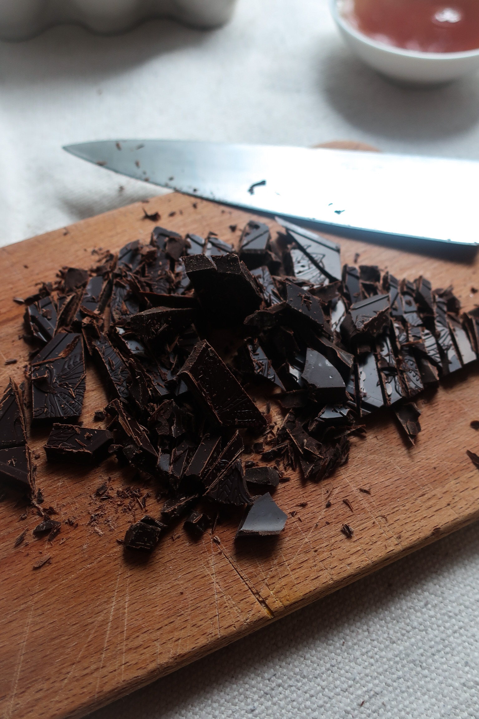 Já vždy volím na pečení hořkou čokoládu s obsahem kakaa kolem 60%, protože upřednostňuji méně sladké dezerty. Vhodné jsou čokolády v tabulce ale nejlepší volbou jsou čokoládové pecičky, ty totiž stačí jen odsypat ze sáčku a navíc se rovnoměrně rozpouštějí ve vodní lázni!
