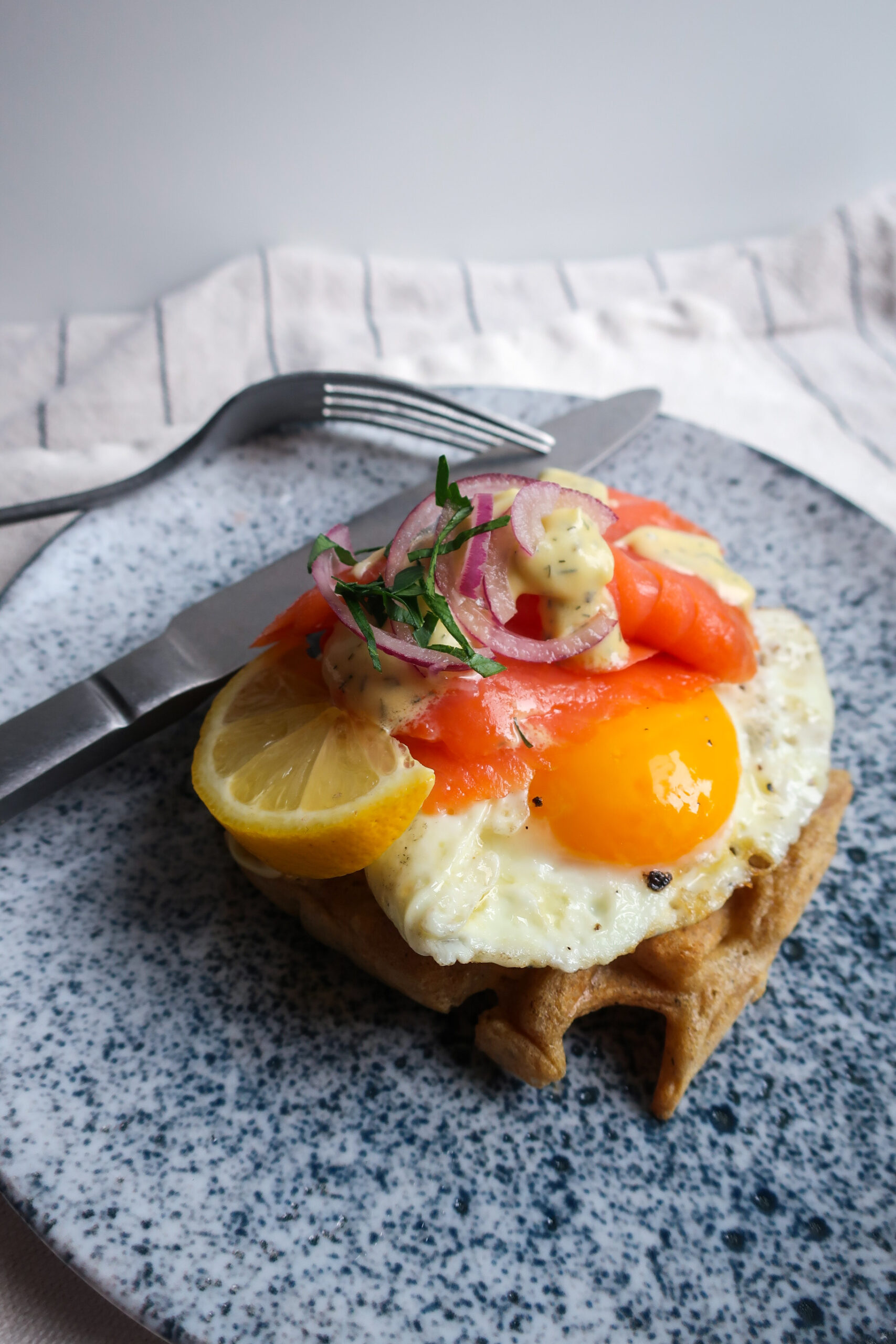 Lehce nakyslá a peprná holandská omáčka je jako stvořená pro kombinaci s uzeným lososem! Vyberte dva pěkné plátky lososa a poklaďte je na vafli. Já v tomto případě nedávala do těsta žádné bylinky, za to do omáčky je úžasné přidat trochu kopru ať čerstvého nebo sušeného! Zakápněte to všechno trochou citronu a přidejte pár najemno nakrájených proužků cibule.