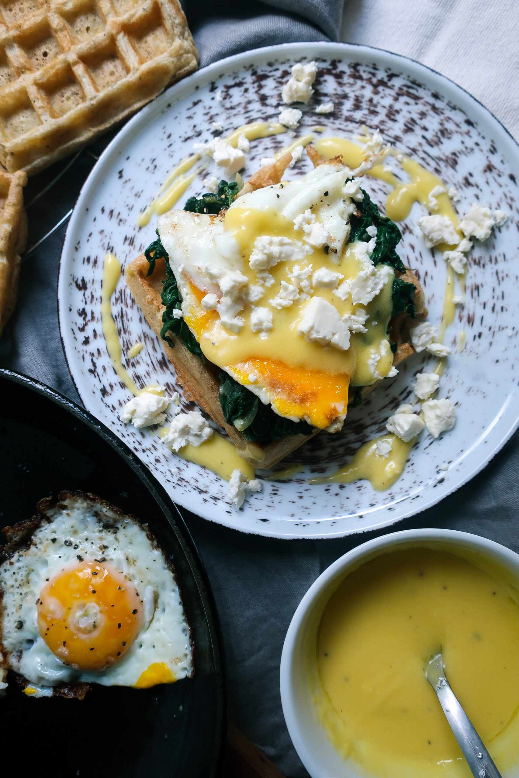 Kombinace sýra feta se špenátem je léty prověřená a když se k němu přidá krémová holandská omáčka, budete okouzleni! Tak trochu vám připomene Řecko a tak trochu téhle kombinace nebudete mít nikdy dost. Špenát stačí spařit a opéct na oleji s trochou česneku. Udělejte si z něj na vafli pěkné hnízdečko, do kterého se perfektně hodí opečené vajíčko. Zalijte omáčkou a zasypte fetou! Pro milovníky řeckých chutí není od věci vše posypat ještě trochou oregana.