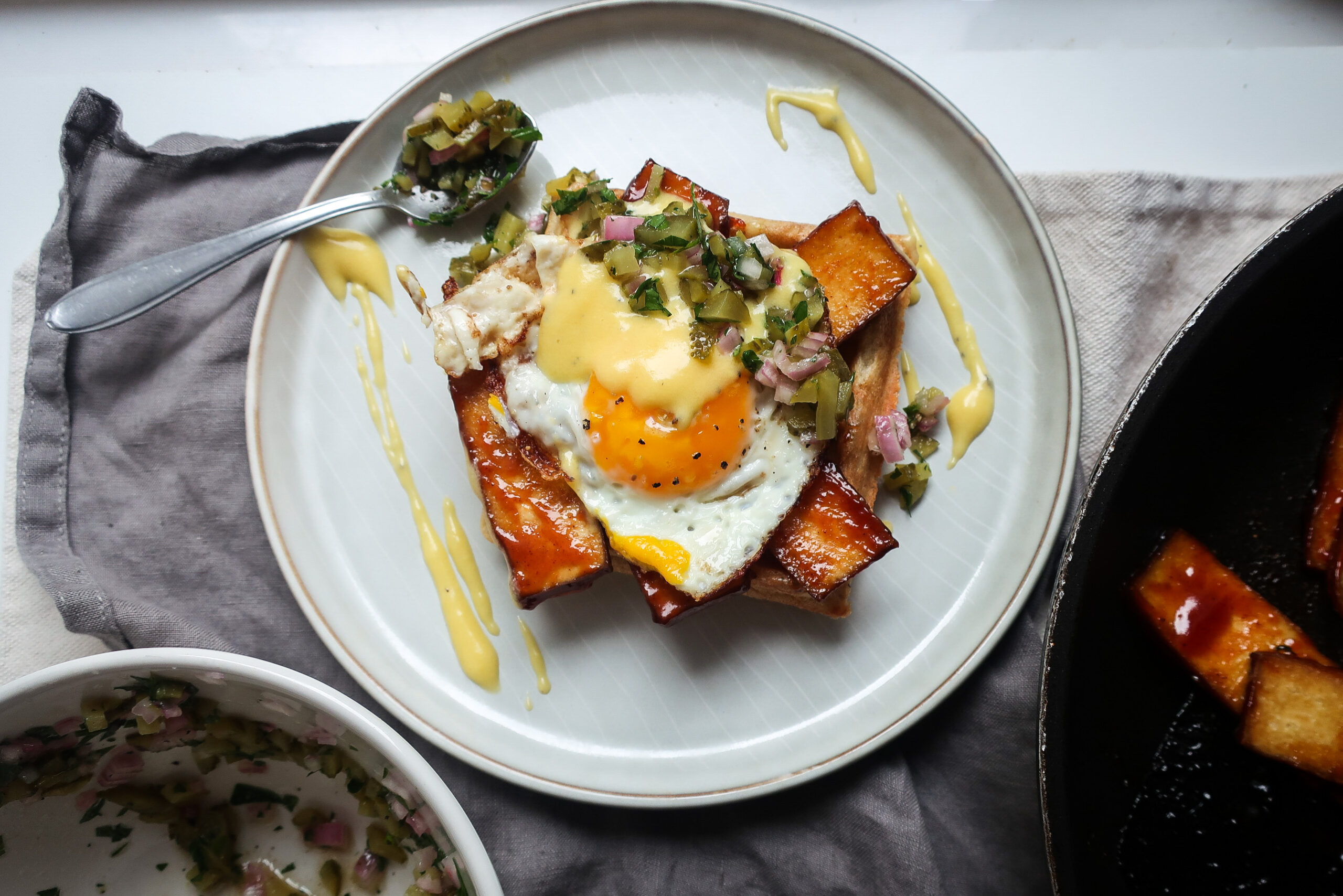 Když si chcete udělat takový VEGE otevřený sendvič, který chutná jako burger! Tofu nakrájejte na tenké plátky a prohřejte na pánvi s trochou BBQ omáčky. Už jste zkoušeli tu domácí? A k tomu okurkový relish, díky kterému bude jídlo chutnat jako hamburger, jak ho znáte a milujete! Na malé kostičky nakrájejte kyselou okurku, šalotku nebo červenou cibulku a trochu zelené petrželky. Smíchejte spolu se lžičkou octa, kokosového sirupu, oleje a špetkou soli a pepře. Relish přidejte až nahoru spolu s holandskou omáčkou a užívejte!