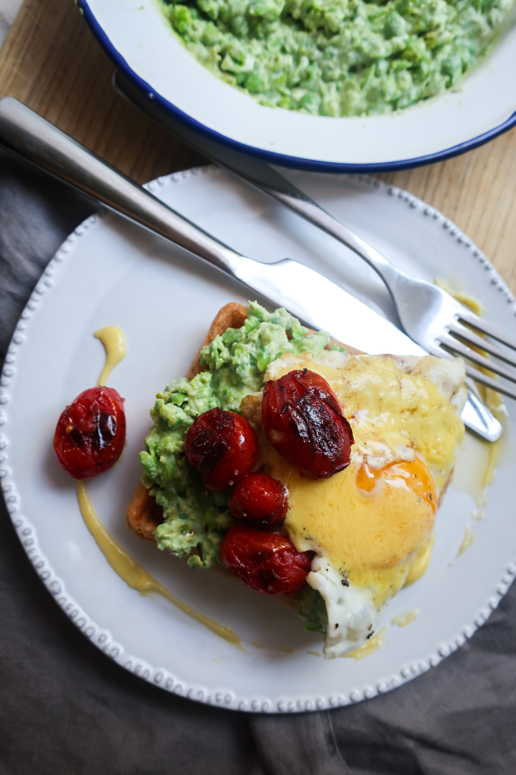 Mačkaný hrášek připomíná tak trochu guacamole. V míse smíchejte rozmražený hrášek s trochou zakysané smetany, citronovou nebo limetkovou šťávou, solí a pepřem a pořádně vidličkou rozmačkejte. Hrášková směs je chutná nejlépe čerstvá, tak je lepší si vždycky udělat menší dávku, která se hned sní. Třešňová rajčátka nařízněte do kříže, posypte solí a opečte na pánvi s trochou balzamikového octa a oleje. Podávejte na vafli s hráškem spolu s vajíčkem.