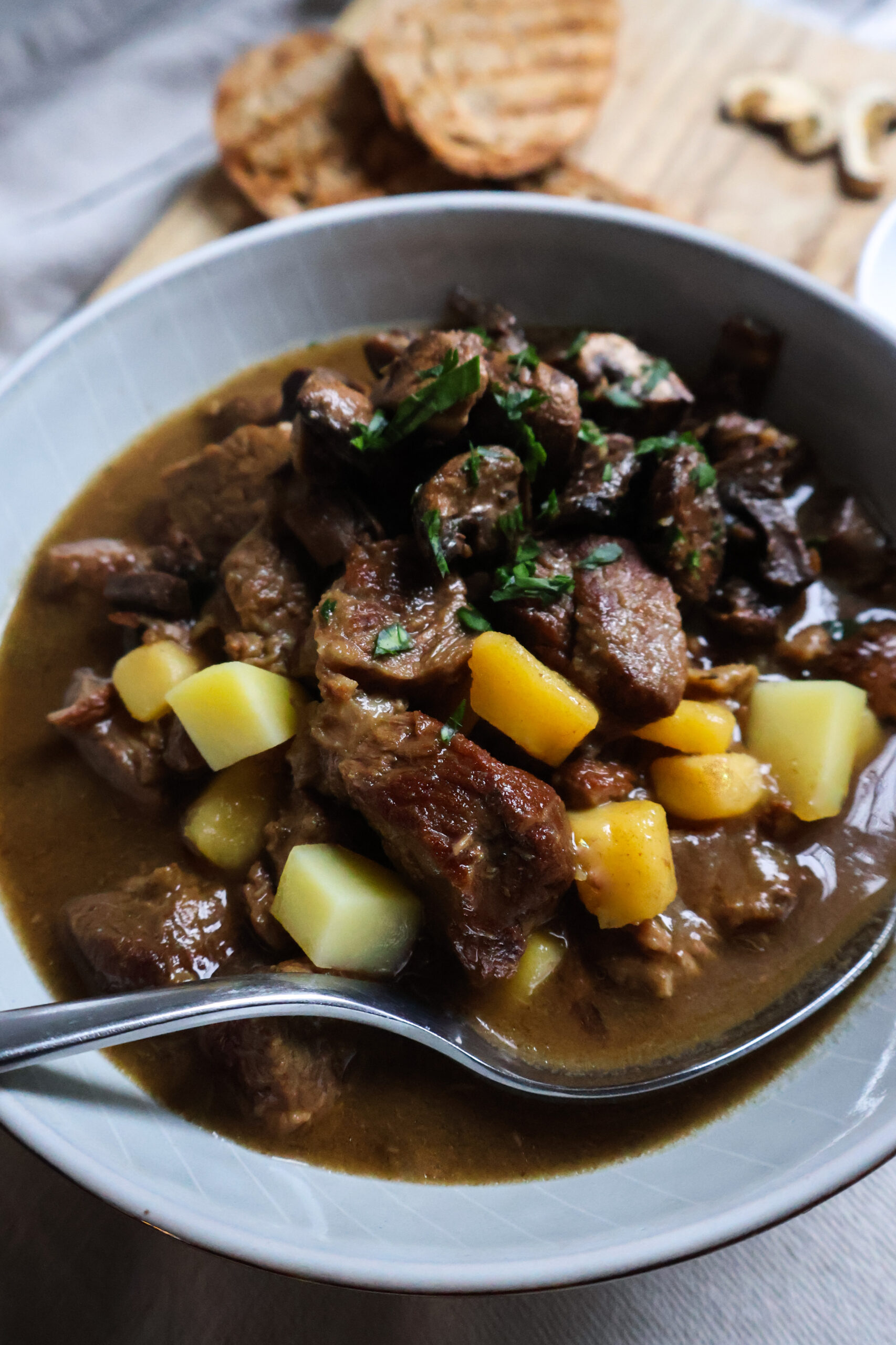 Jak uvařit hovězí guláš s opečenými žampiony a miso pastou?