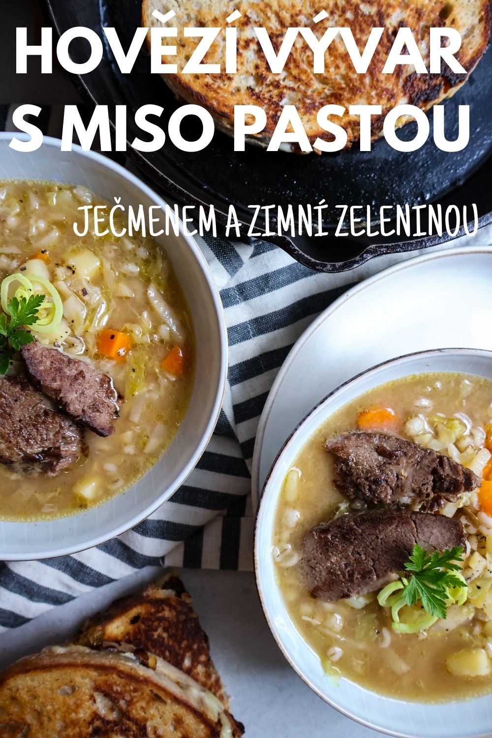 Hovězí vývar s miso pastou, ječmenem a zimní zeleninou