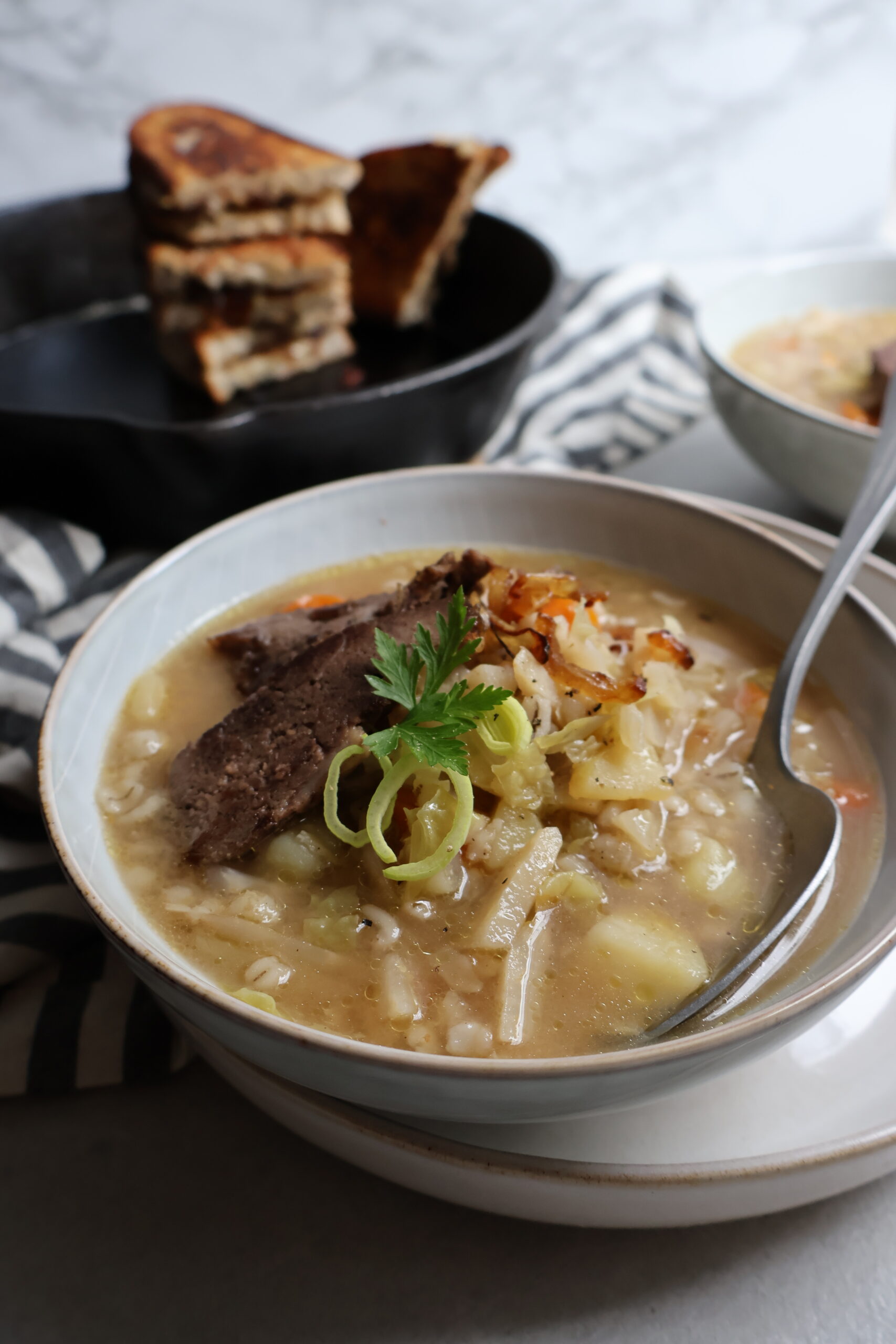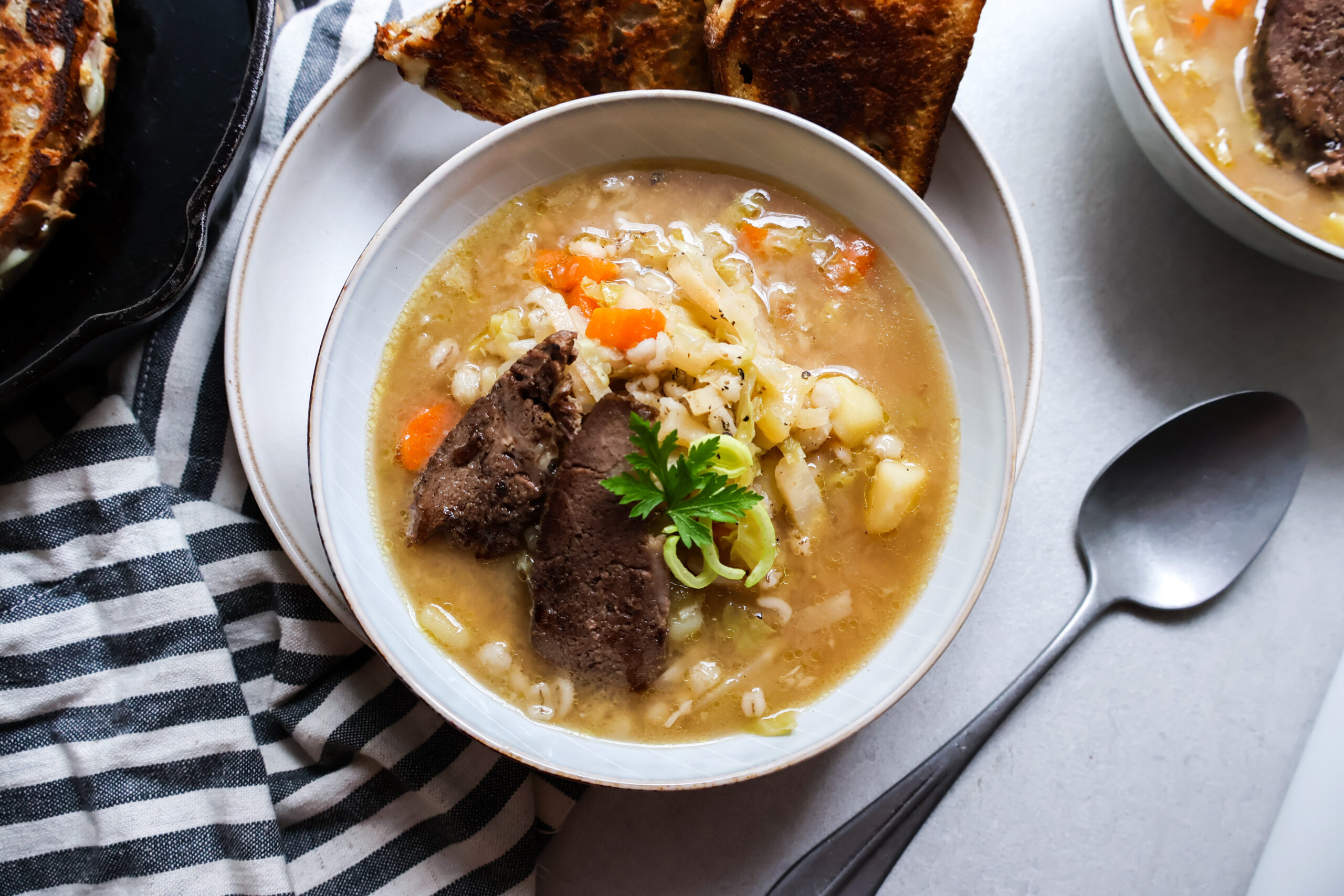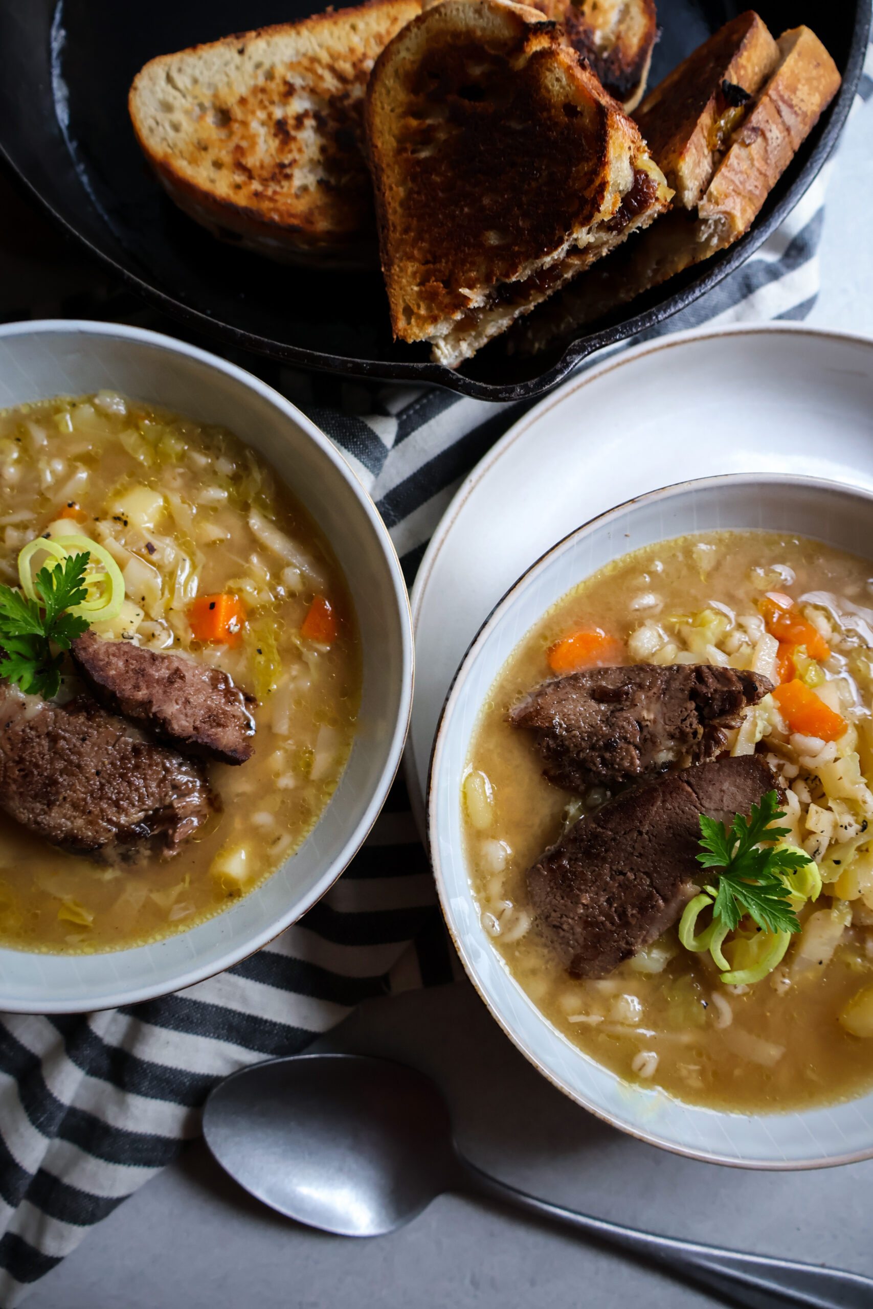 Hovězí vývar se zeleninou a ječmenem je skvělý jen tak, ale víte s čím je úplně nejvíc dokonalý? S křupavými sendviči a ne ledajakými, ale doplněné o úžasně aromatickou zkaramelizovanou cibuli. Tyhle sendviče budete mít připravené dřív, než se vám stihne uvařit zelenina v polévce do měkka!