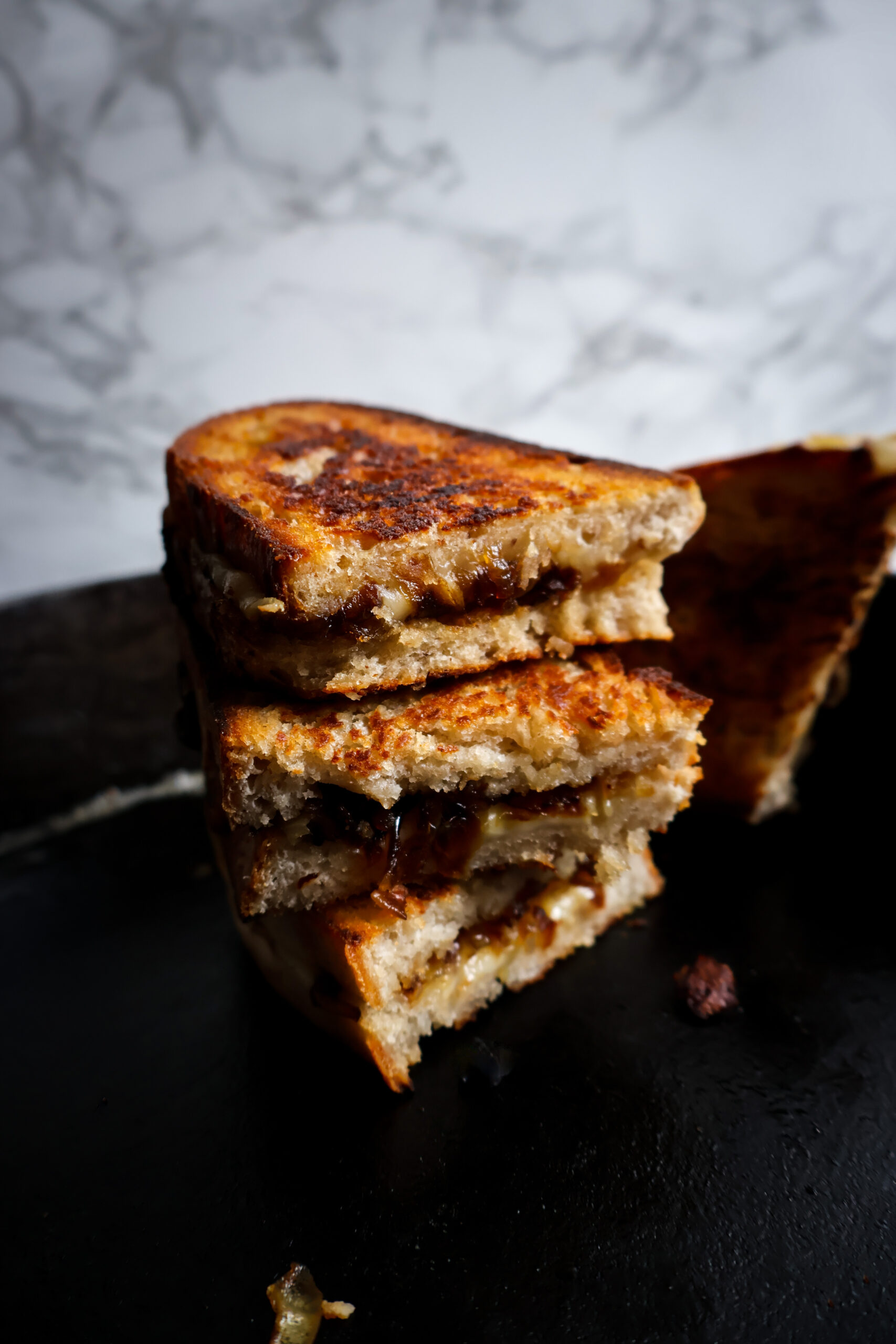 Na sestavení sendvičů použijeme toustový chléb. Na plátek chleba přidáme lžíci zkaramelizované cibulky a poklademe plátky sýra. Ideální je použít tučnější sýr jako je eidam, gouda nebo ementál, který má cca 45% tuku v sušině. Díky tuku se vám bude sýr po upečení krásně táhnout! Sendviče opékáme v panini grilu, nebo z obou stran na pánvi s trochou másla. Podáváme ještě teplé spolu s polévkou.