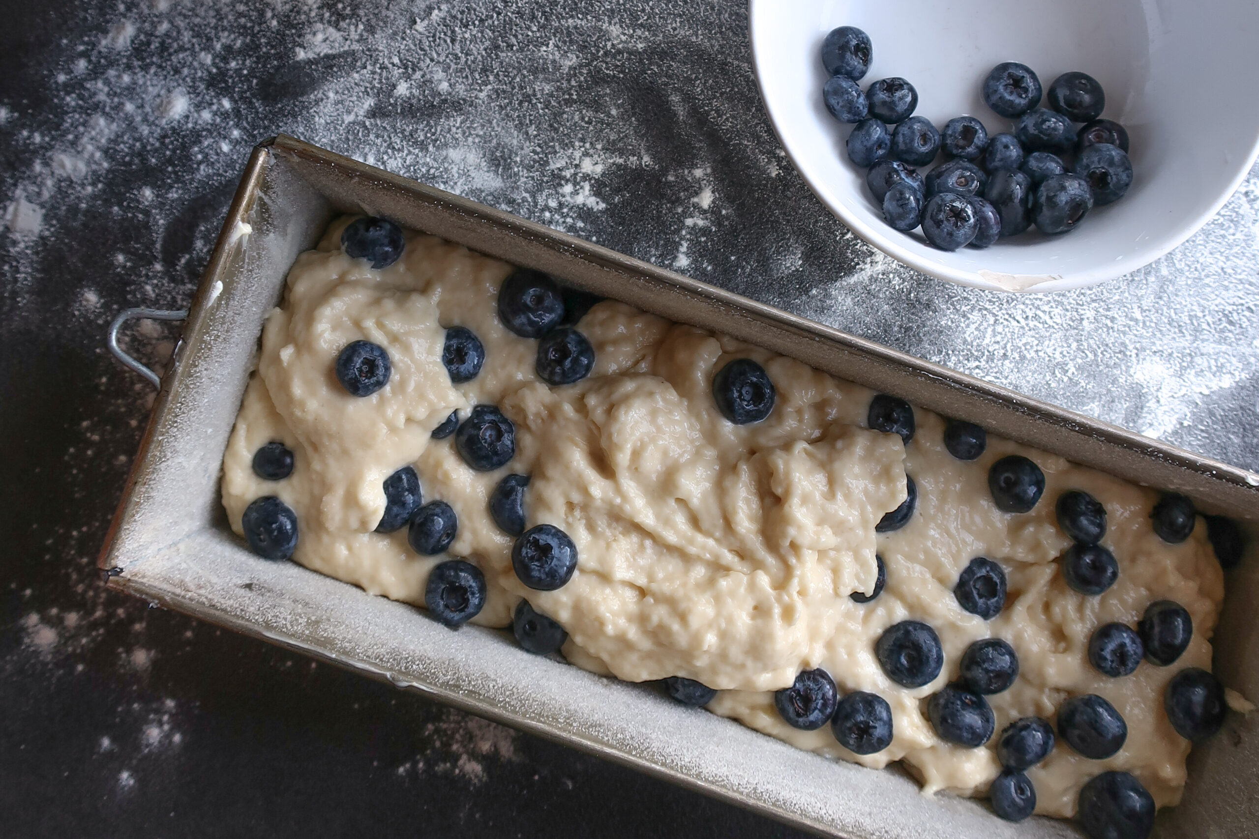 Vymažeme si velkou chlebíčkovou formu o velikosti cca 29x12cm a vysypeme ji hrubou moukou (nebo použijeme pečící papír). Na dno formy lžící naneseme 1/3 těsta a lehce rozprostřeme, to posypeme polovinou připravených borůvek, na to naneseme lžící druhou 1/3 těsta a posypeme druhou polovinou borůvek a nakonec zase třetí 1/3 těsta. Pokud sem tam čouhá na vrchu borůvka tak to ničemu nevadí – při pečení se ovoce nespálí.
