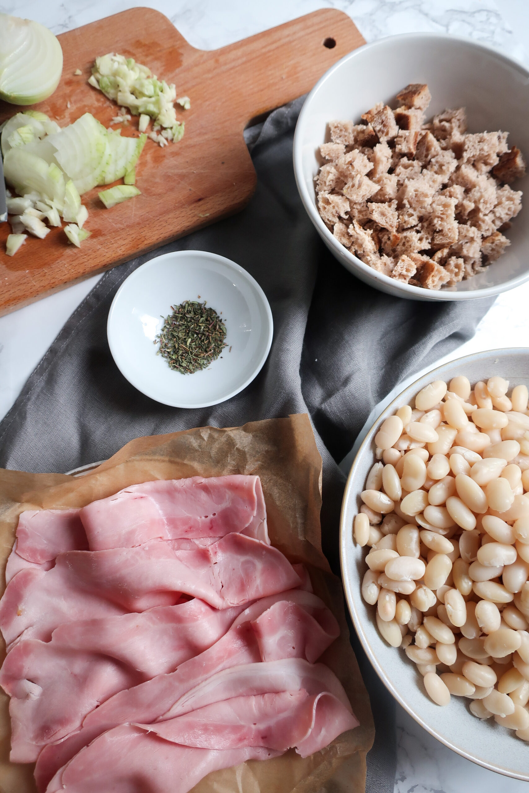 Přes noc namočené fazole scedíme a ve velkém hrnci s vodou je vaříme společně s bobkovým listem a 0,5 ČL soli cca 30 minut do změknutí. Vařené fazole poté scedíme a bobkový list vyndáme. Hrnec velmi dobře vypláchneme a pak v něm na oleji opečeme kostičky šunky. Opečenou šunku vybereme děrovanou naběračkou nebo lžící na talířek.
