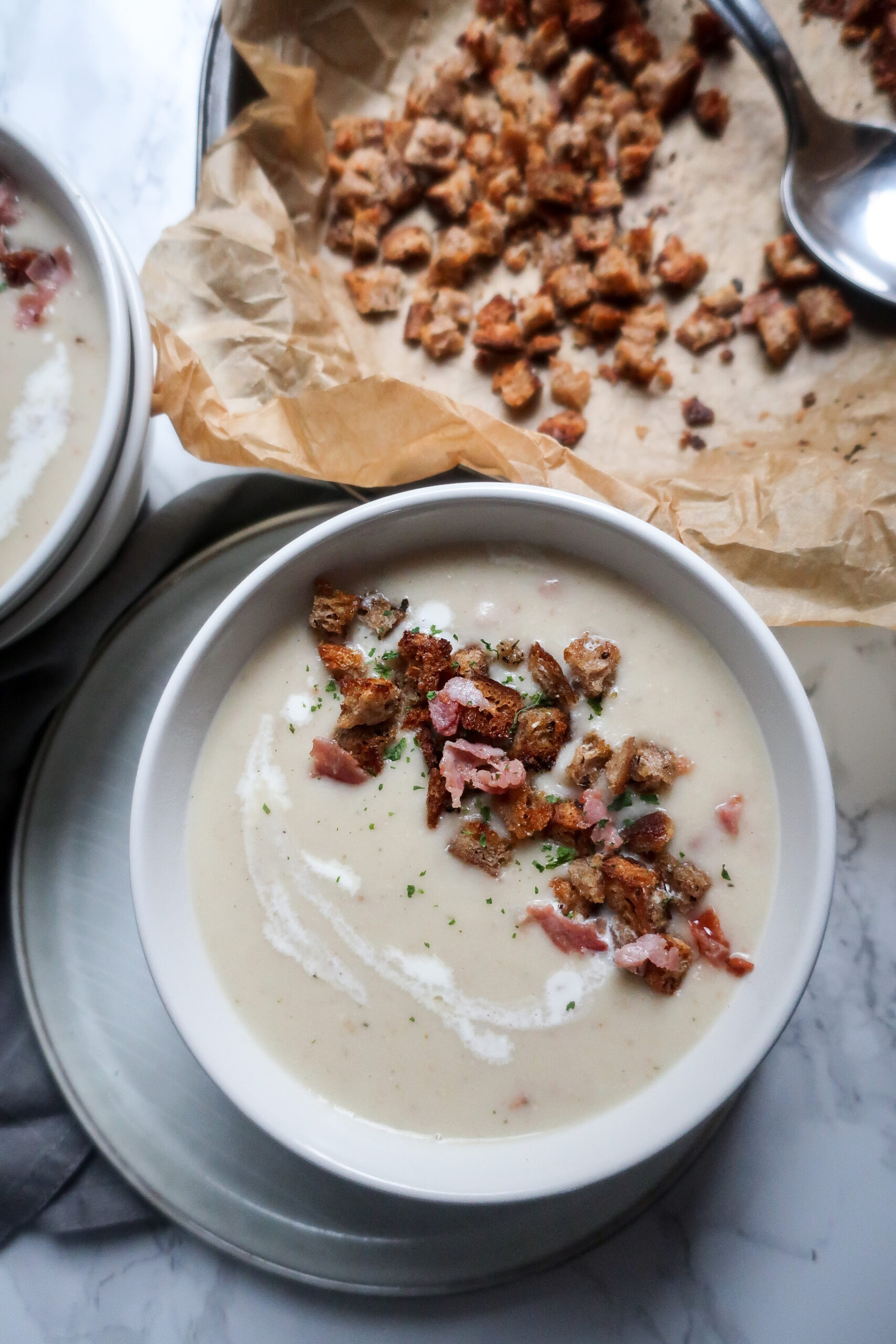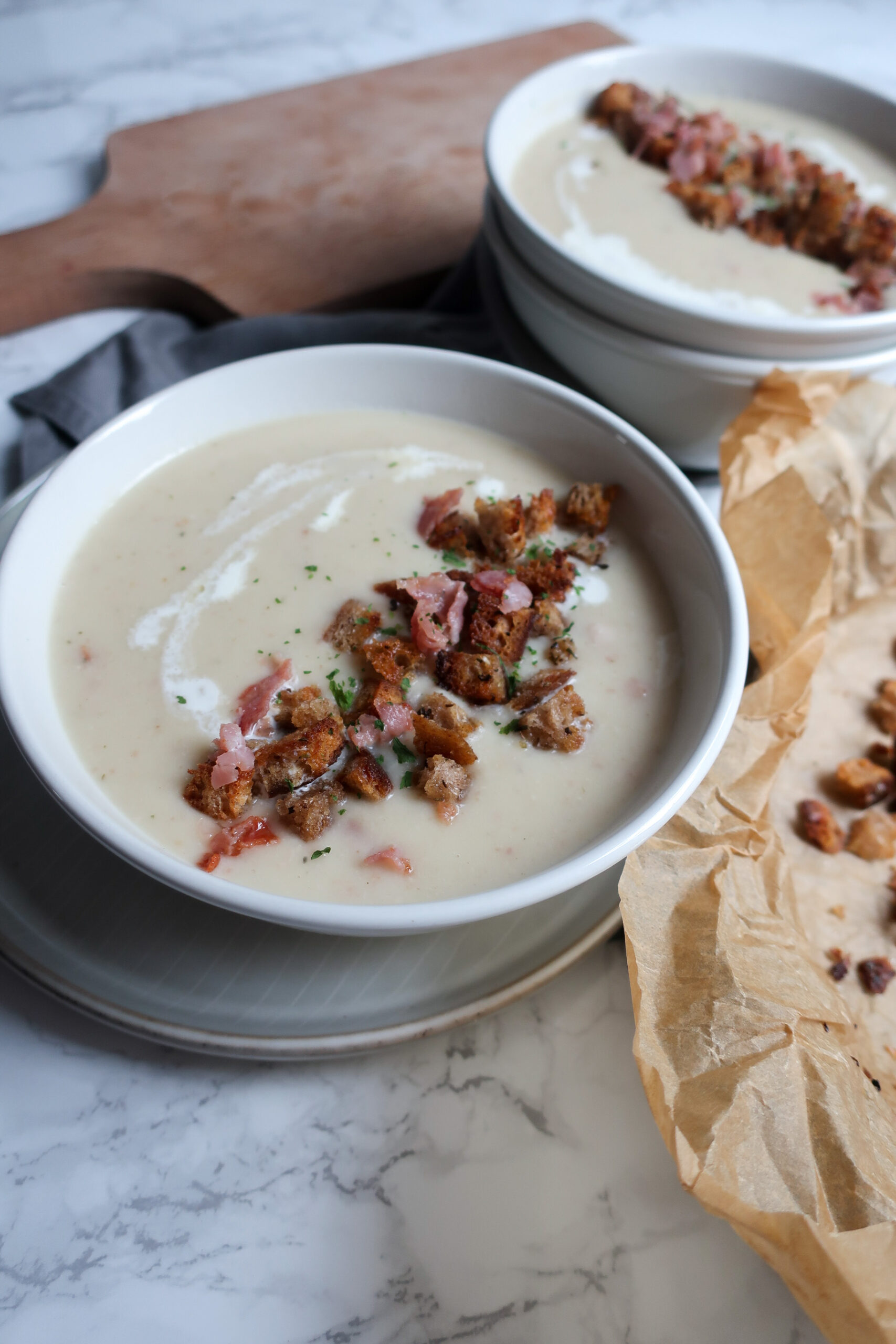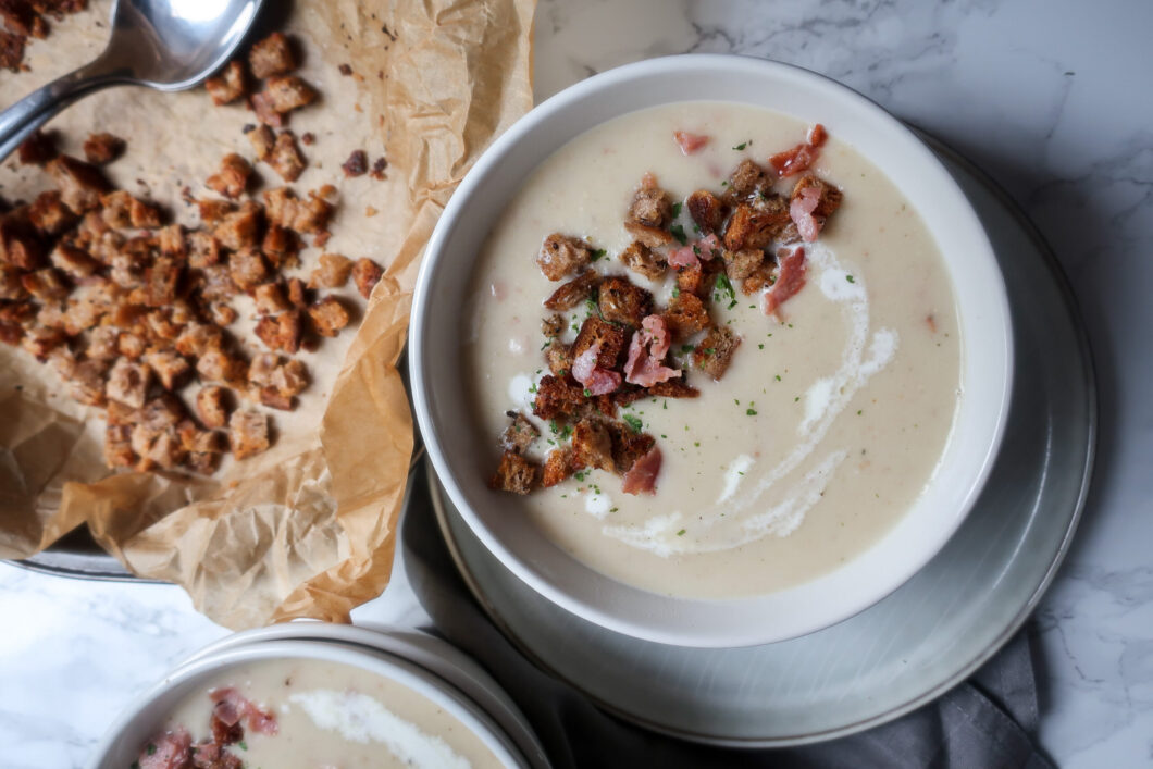 - Hotovou polévku rozmixujeme tyčovým mixérem. Poté přidáme druhou polovinu opečené šunky a 2 PL smetany ke šlehání na zjemnění. Polévku podáváme posypanou krutony.