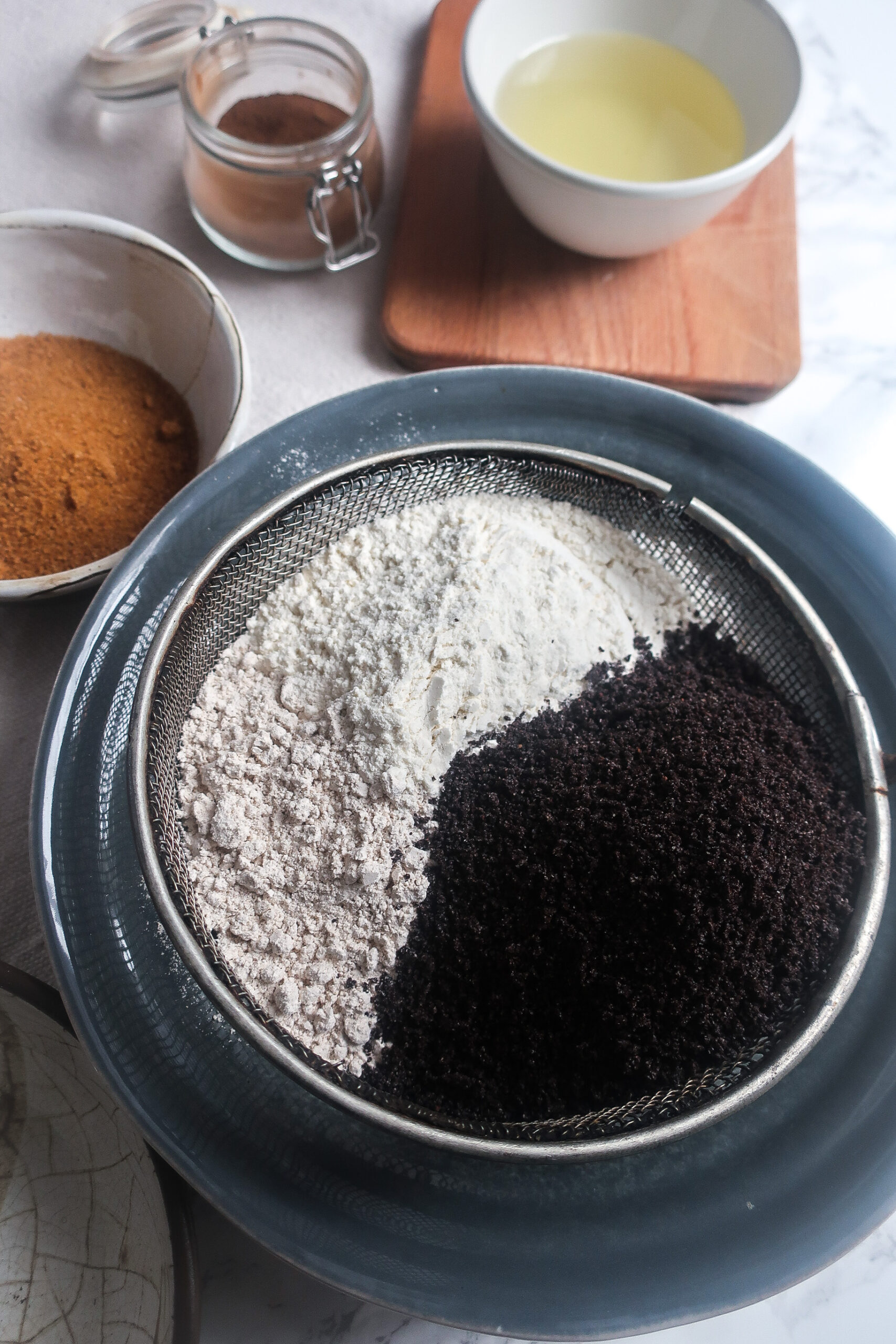 Do velké mísy dáme velký cedník a odměříme pomoci hrnku mletý mák, hladkou mouku a celozrnnou mouku. Dále přidáme prášek do pečiva, sůl, třtinový cukr a skořici. Vše prosejeme do mísy a zamícháme metličkou.