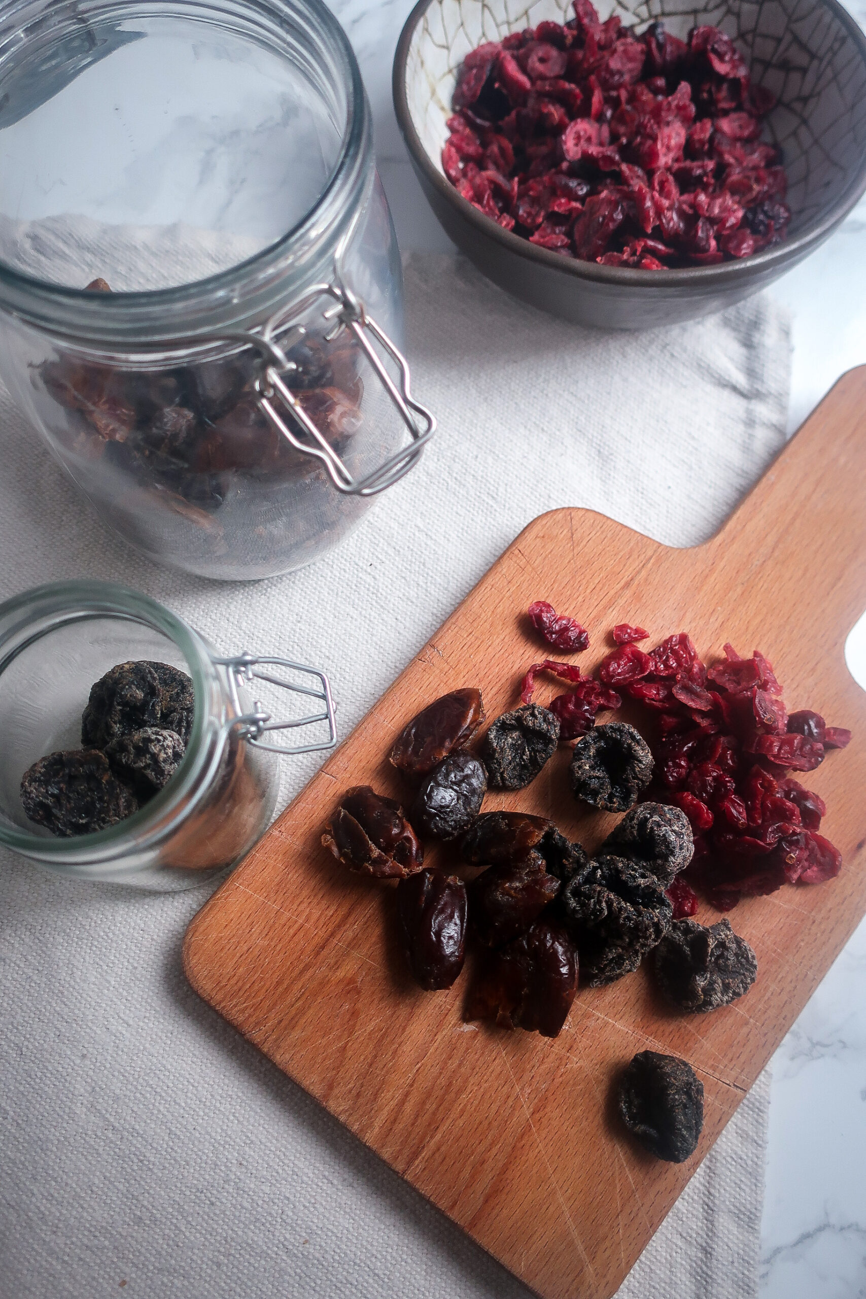 Asi nikoho z vás nepřekvapí, že mák naprosto skvěle ladí se sušenými švestkami, tudíž ty jsou u mě vždycky první volba. Jelikož ale nejsem žádný troškař, zkombinovala jsem švestky ještě se sušenými brusinkami a sušenými datlemi. Neznám přesný důvod proč, ale tahle kombinace chutí je naprosto dokonalá.