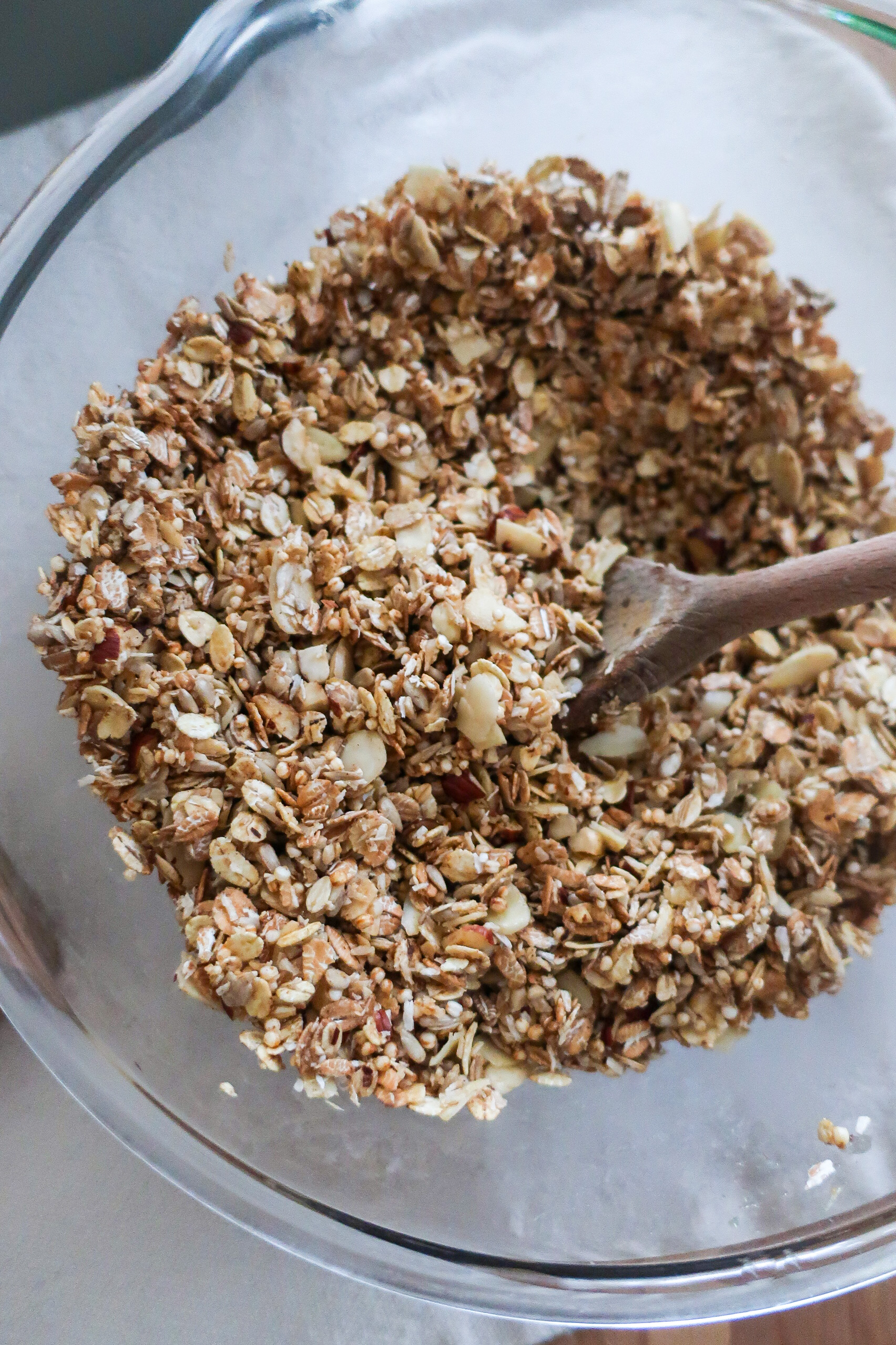 Nejdříve si rozpálíme troubu na 150°C horkovzduch. Do velké mísy dáme všechny suché ingredience kromě sušeného ovoce. Smícháme tedy ovesné vločky, strouhaný kokos, plátky mandlí, slunečnicová semínka, pufovanou quinou, nasekané lískové oříšky, skořici a špetku soli.
