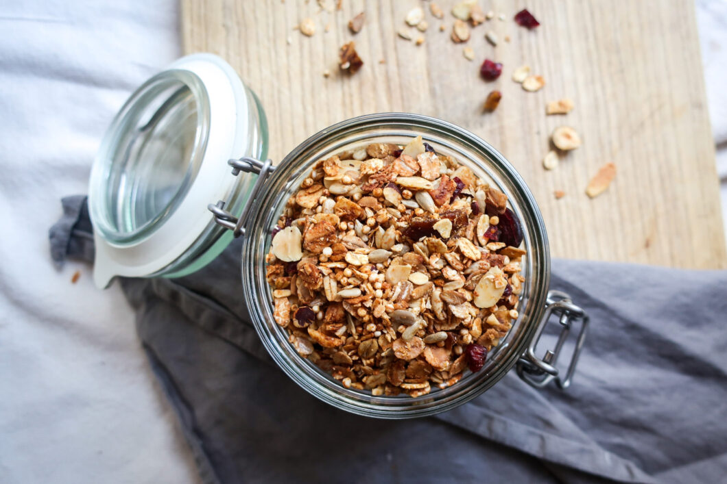 • pufovaná quinoa – díky pufované quinoe bude granola lehčí a jemnější. Dá se zaměnit za pufované jáhly, pohanku nebo burizony.