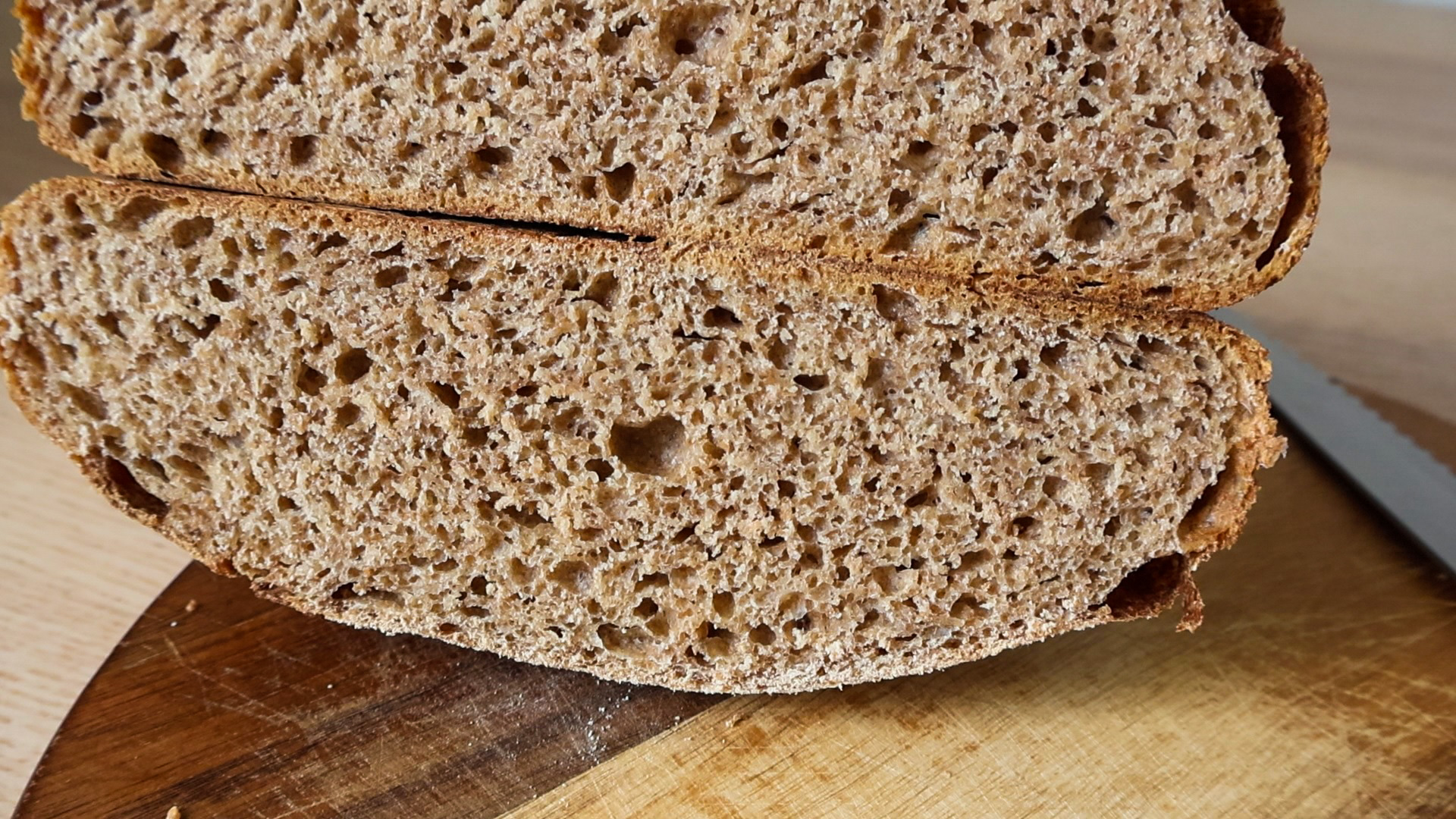 Kváskový chléb s jemnou střídkou, pravidelnými menšími oky, zdravý a plný jemné lehce oříškové chuti. A je to teda hit!