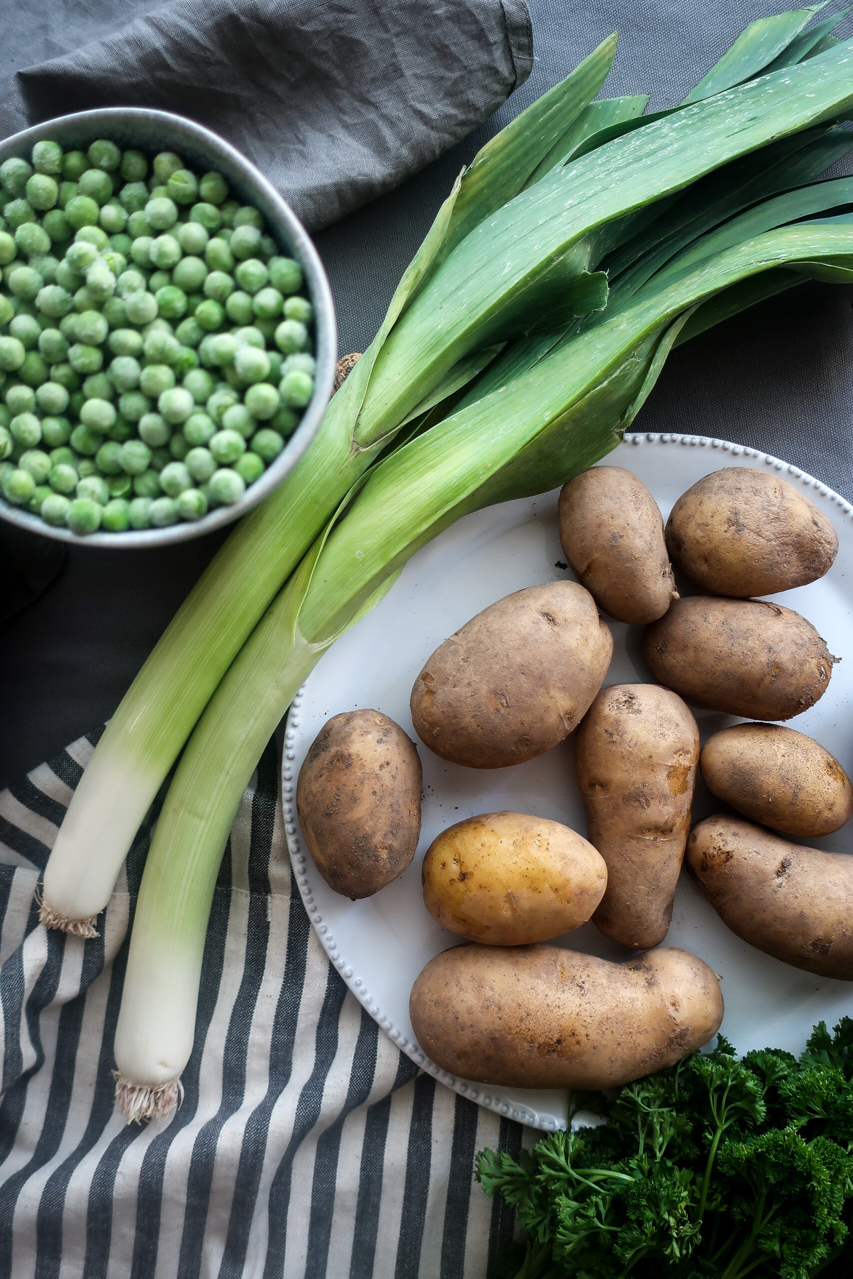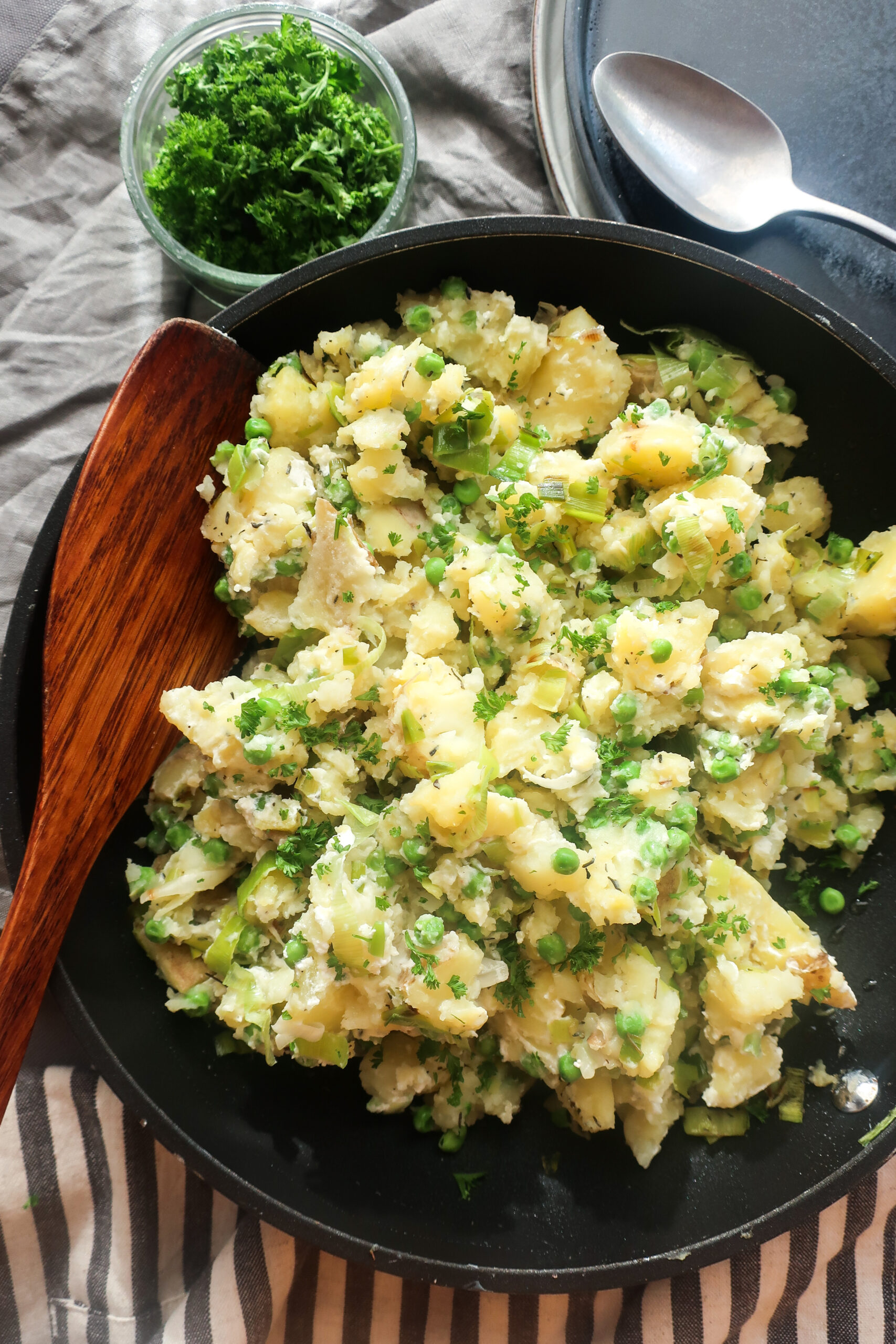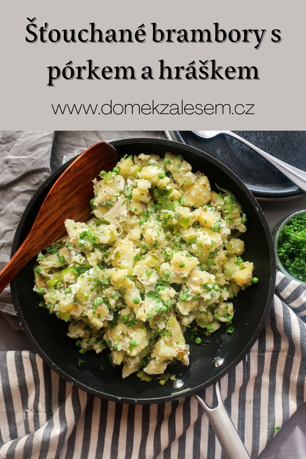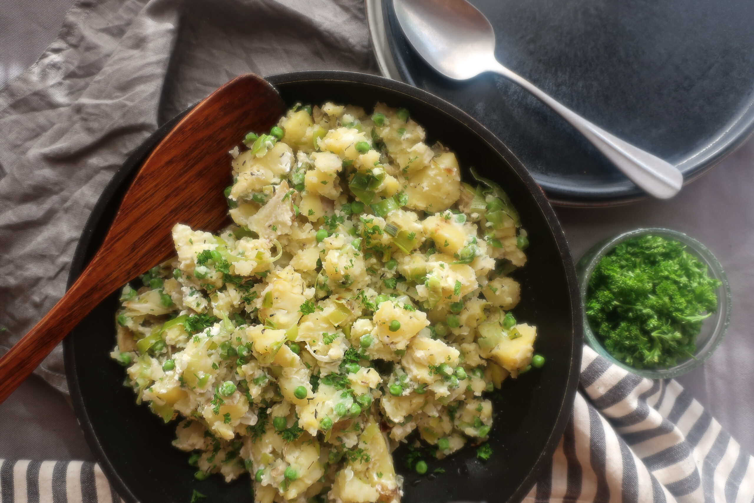 Šťouchané brambory s pórkem a hráškem