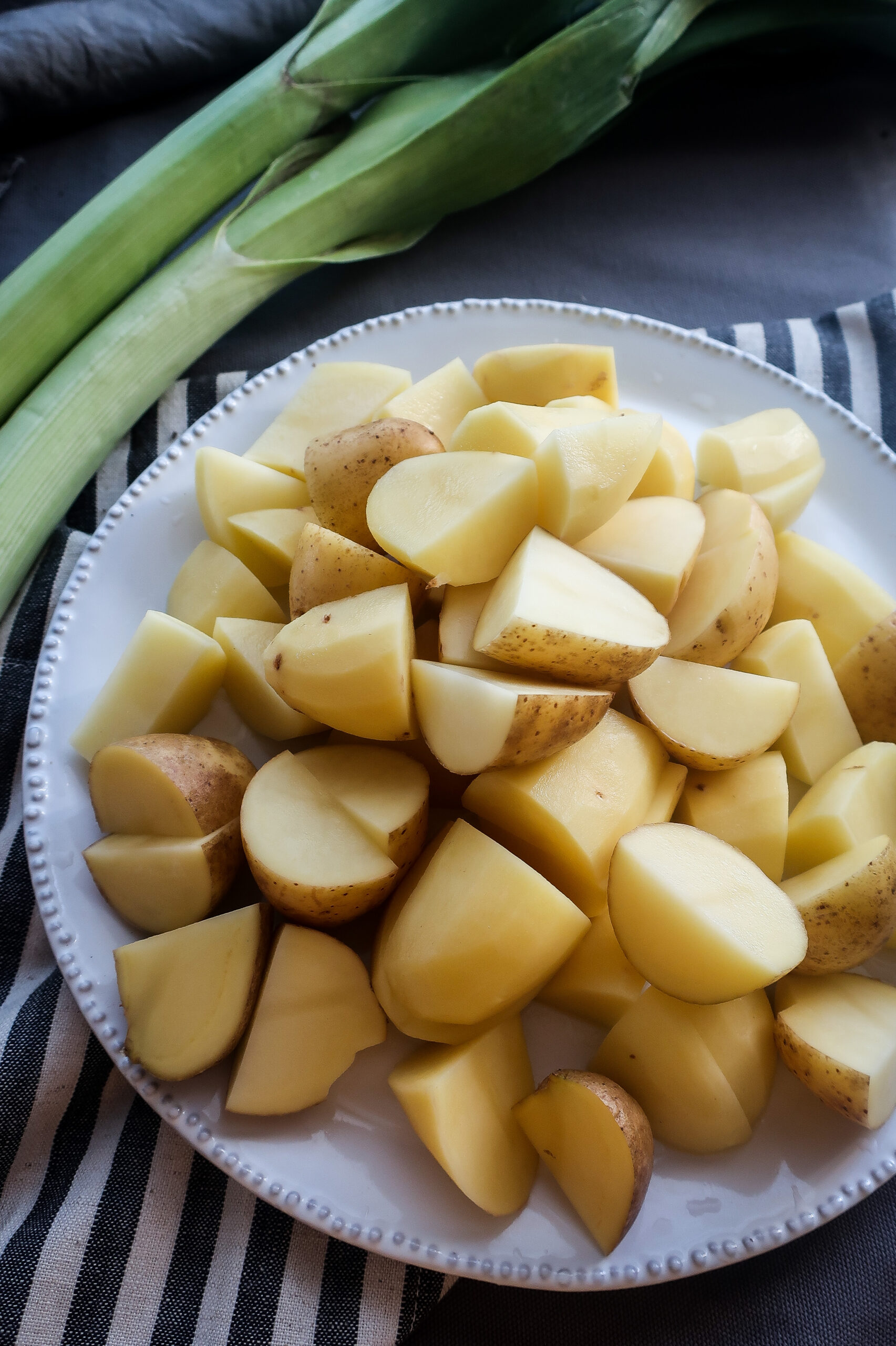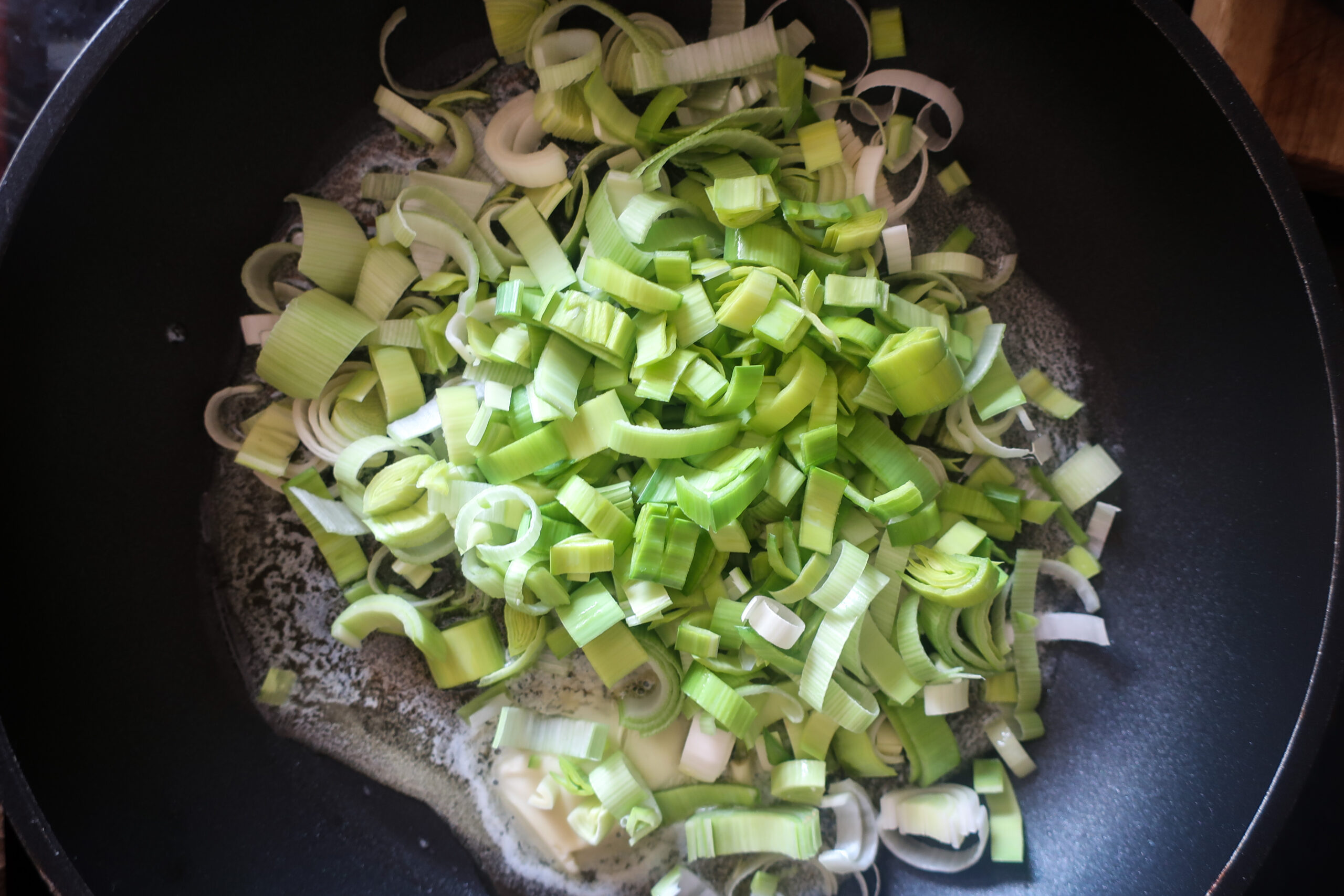 Zatímco se brambory vaří, tak si ve velké pánvi rozehřejeme máslo a přidáme na proužky nakrájený pórek. Z pórku krájíme pouze světlou část a před krájením pořádně omyjeme, protože mezi jednotlivými vrstvami pórku se často zachycuje hlína.