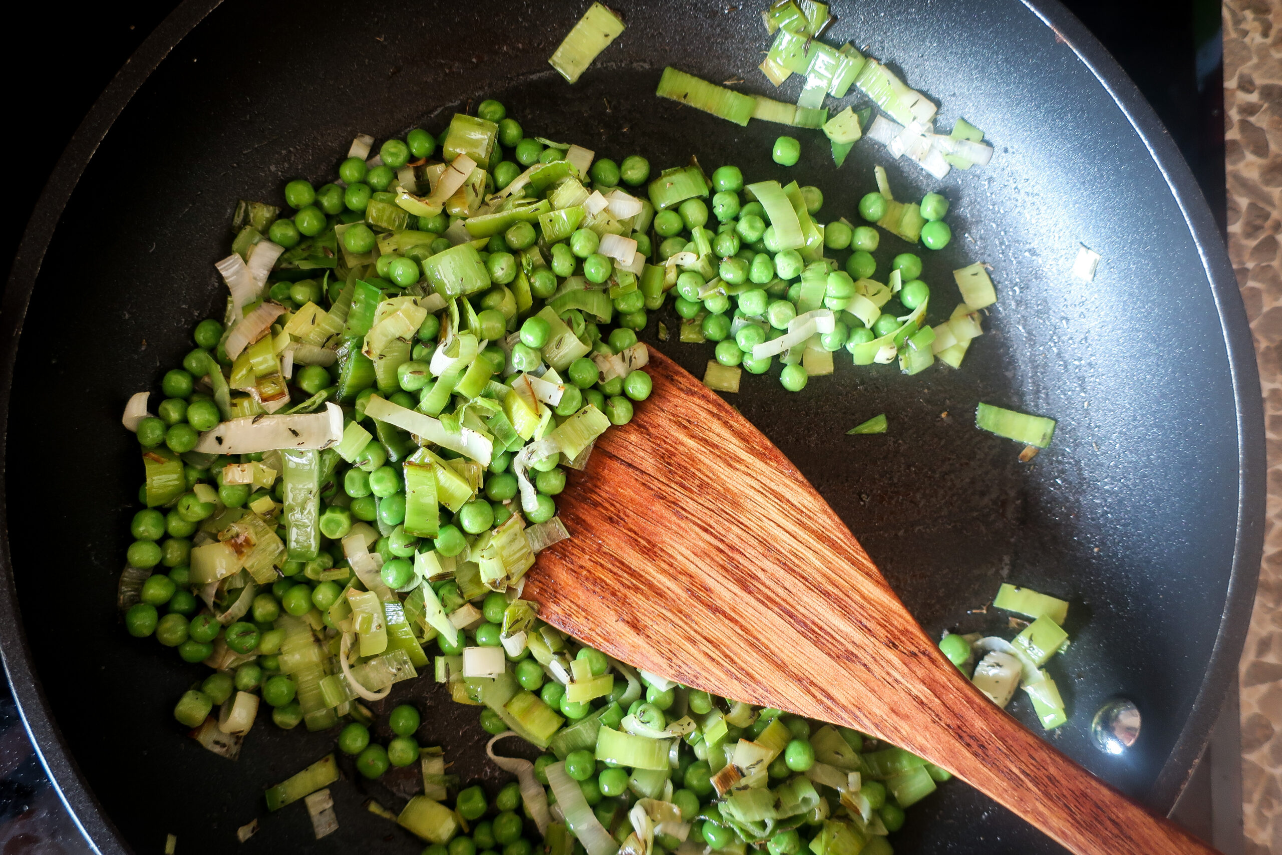 Do pánve k nakrájenému pórku přidáme sůl, pepř a tymián a opékáme dokud pórek nezměkne. Poté přidáme mražený hrášek a necháme pár minut prohřát.